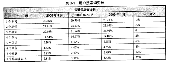 據(jù)著名市場調(diào)研公司 Hitwise 2009年2 月的研究,用戶實際使用的搜索詞有越來越長的趨勢,如表 3-1 所示是 2008 年 1 月到2009 年 1 月用戶搜索關(guān)鍵詞長度變化趨勢 。