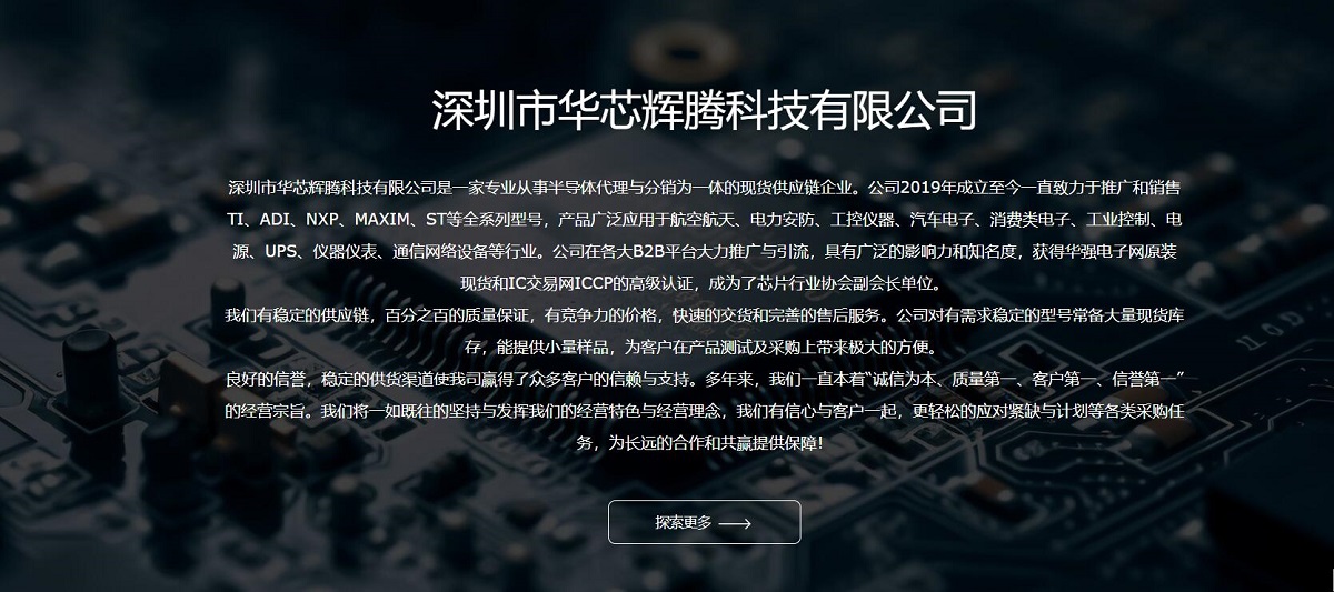 深圳市華芯輝騰科技有限公司是一家專業(yè)從事半導(dǎo)體代理與分銷為一體的現(xiàn)貨供應(yīng)鏈企業(yè)。公司2019年成立至今一直致力于推廣和銷售TI、ADI、NXP、MAXIM、ST等全系列型號,產(chǎn)品廣泛應(yīng)用于航空航天、電力安防、工控儀器、汽車電子、消費類電子、工業(yè)控制、電源、UPS、儀器儀表、通信網(wǎng)絡(luò)設(shè)備等行業(yè)。公司在各大B2B平臺大力推廣與引流。