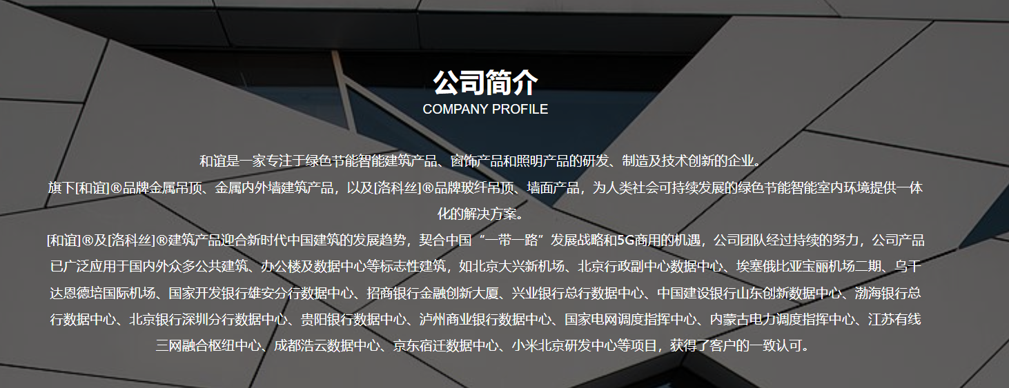 旗下[和誼]®品牌金屬吊頂、金屬內(nèi)外墻建筑產(chǎn)品,以及[洛科絲]®品牌玻纖吊頂、墻面產(chǎn)品,為人類社會(huì)可持續(xù)發(fā)展的綠色節(jié)能智能室內(nèi)環(huán)境提供一體化的解決方案。