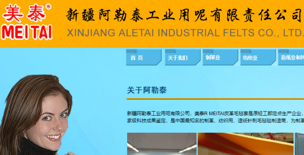 新疆阿勒泰工業(yè)用呢有限責(zé)任公司,成立于1966年,是原輕工部定點(diǎn)生產(chǎn)皮革毛氈套企業(yè),先后多次承擔(dān)省部級(jí)科技創(chuàng)新項(xiàng)目,在皮革、紡織印染、造紙行業(yè)等多項(xiàng)科技成果通過國(guó)家級(jí)科技成果鑒定,是中國(guó)最知名的針刺毛氈套制造商,為制革、紡織、造紙廠商提供50多種不同型號(hào)、用途的皮革毛氈套、預(yù)縮加厚呢毯、造紙毛毯。美泰 MEITAI 氈毯直接服務(wù)客戶,2012年獲中國(guó)紡織科技進(jìn)步二等獎(jiǎng),2013年獲全國(guó)工商聯(lián)科技進(jìn)步優(yōu)秀獎(jiǎng)。產(chǎn)品替代進(jìn)口,填補(bǔ)國(guó)內(nèi)空白,整體技術(shù)與產(chǎn)品綜合性能達(dá)到國(guó)際先進(jìn)水平。產(chǎn)品遠(yuǎn)銷國(guó)內(nèi)二十多個(gè)省市自治區(qū),并出口歐亞、非洲、美洲國(guó)際市場(chǎng)。
