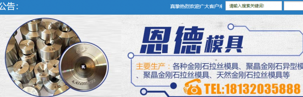 河間市恩*模具有限公司坐落于華北平原 中部,地處京、津、石三地的河北省河間市西村工業(yè)區(qū),交通便利,地理位置優(yōu)越。我公司專業(yè)生產(chǎn)各種金剛石拉絲模具、聚晶金剛石異型模具、聚晶金剛石拉絲模 具、天然金剛石拉絲模具、硬質(zhì)合金(鎢鋼)模具等產(chǎn)品,并具有各種機械設(shè)備。我公司占地面積1000多平米,擁有一批技工,同時我公司積極引進先進機 械設(shè)備,自動檢測,顯示工作精度,保障產(chǎn)品品質(zhì)。同時更注重質(zhì)量控制和現(xiàn)場管理,強化過程監(jiān)控,確保生產(chǎn)的各類產(chǎn)品品質(zhì)。我公司以質(zhì)量為本,信譽至上為宗 旨。以優(yōu)良的售后服務得到廣大客戶的青睞,并在同行業(yè)中取得較高的知名度。