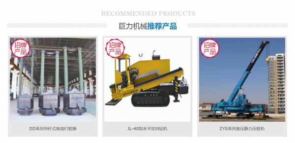 生產(chǎn)產(chǎn)品:DD系列導(dǎo)桿式柴油打樁錘2.5噸、3.2噸、4.0噸、5.3噸、6.3噸、7.3噸、8.3噸、9.3噸、10.3噸、11.3噸、12.8噸、16噸、20噸,樁機(jī)系列40型,60型,80型走管式及360度步履回轉(zhuǎn)式樁機(jī),120噸至1000噸靜壓力樁機(jī);非開挖導(dǎo)向鉆機(jī)JL-15型、JL-20型、JL-28型、JL-32型、JL-40型、JL-68型、JL-245型,并配套供應(yīng)各種鉆桿、鉆具、零部件、導(dǎo)向儀等。