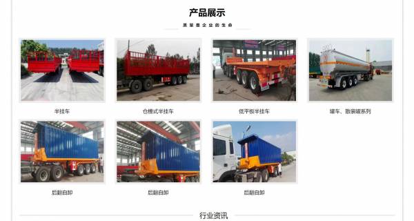 目前我公司生產(chǎn)集裝箱平板半掛車、集裝箱運(yùn)輸車、主車、半掛自卸車、各種系列半掛車、全掛車、廂式貨車、車輛運(yùn)輸車、上海50掛、天津60掛車,車輛噸位從8噸*60噸不等,產(chǎn)品種類有40多種,并承接專用車及**車輛的改裝設(shè)計(jì)業(yè)務(wù)。采用新技術(shù)、新工藝、新材料,及時(shí)聽取市場(chǎng)反饋,快速把握市場(chǎng)先機(jī),勇于創(chuàng)新,專用掛車經(jīng)過較近幾年的突破性發(fā)展,成為公司主流、主導(dǎo)產(chǎn)品,銷售量每年都以90%以上的速度遞增,在全國(guó)同行業(yè)中銷售排名前列。