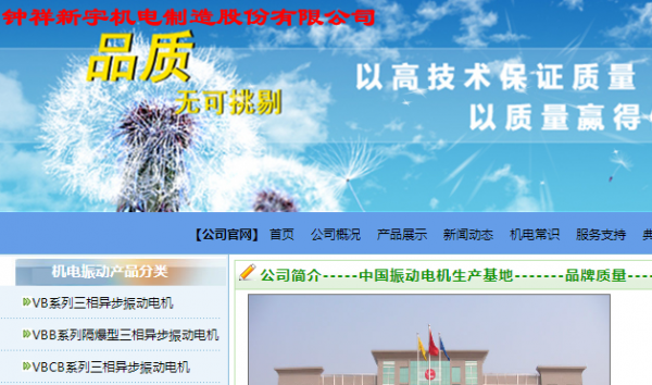 鐘祥新宇機(jī)電制造股份有限公司前身是鐘祥電機(jī)廠,創(chuàng)建于1968年,于2014年9月24日由“鐘祥新宇機(jī)電制造有限公司”變更名為“鐘祥新宇機(jī)電制造股份有限公司”。主要生產(chǎn)各類振動(dòng)電機(jī)、振動(dòng)機(jī)械、輸送機(jī)械。是中國電器工業(yè)協(xié)會(huì)中小型電機(jī)分會(huì)理事單位、中國重型機(jī)械工業(yè)協(xié)會(huì)洗選設(shè)備專業(yè)委員會(huì)理事單位,是中國具備真實(shí)生產(chǎn)實(shí)力的振動(dòng)電機(jī)生產(chǎn)廠家??蒲虚_發(fā)力量雄厚,公司技術(shù)中心認(rèn)定為“湖北省企業(yè)技術(shù)中心”,現(xiàn)有教授級(jí)高級(jí)工程師2人,享受國家政府津貼專家2人,是國家部頒(行業(yè))標(biāo)準(zhǔn)《振動(dòng)源三相異步振動(dòng)電機(jī)技術(shù)條件》的主要制訂單位。企業(yè)內(nèi)部局域網(wǎng)、公司網(wǎng)站、CAD設(shè)計(jì)系統(tǒng)、互聯(lián)網(wǎng)已構(gòu)筑起企業(yè)計(jì)算機(jī)信息管理系統(tǒng);企業(yè)質(zhì)量管理體系獲得ISO9001:2000質(zhì)量管理體系認(rèn)證證書;產(chǎn)品獲CQC認(rèn)證和CCC認(rèn)證;享有“外貿(mào)進(jìn)出口自營權(quán)”。是國內(nèi)很早生產(chǎn)振動(dòng)電機(jī)的廠家之一,生產(chǎn)的“宇興”牌振動(dòng)電機(jī)是國內(nèi)振動(dòng)電機(jī)行業(yè)和廣大客戶公認(rèn)的品牌產(chǎn)品。