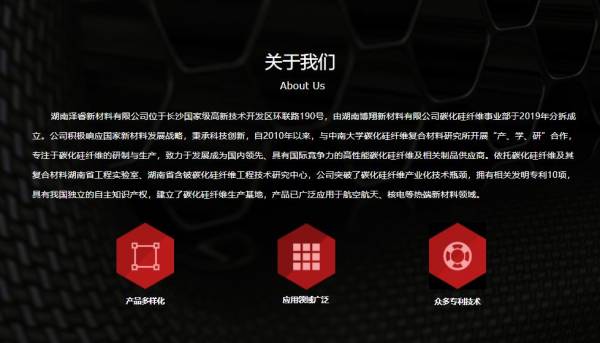 湖南澤睿新材料有限公司位于長沙國家級高新技術(shù)開發(fā)區(qū)環(huán)聯(lián)路190號,由湖南博翔新材料有限公司碳化硅纖維事業(yè)部于2019年分拆成立。公司積極響應(yīng)國家新材料發(fā)展戰(zhàn)略,秉承科技創(chuàng)新,自2010年以來,與中南大學(xué)碳化硅纖維復(fù)合材料研究所開展“產(chǎn)、學(xué)、研”合作,專注于碳化硅纖維的研制與生產(chǎn),致力于發(fā)展成為國內(nèi)領(lǐng)先、具有國際競爭力的高性能碳化硅纖維及相關(guān)制品供應(yīng)商。依托碳化硅纖維及其復(fù)合材料湖南省工程實驗室、湖南省含鈹碳化硅纖維工程技術(shù)研究中心,公司突破了碳化硅纖維產(chǎn)業(yè)化技術(shù)瓶頸,擁有相關(guān)發(fā)明專利10項,具有我國獨立的自主知識產(chǎn)權(quán),建立了碳化硅纖維生產(chǎn)基地,產(chǎn)品已廣泛應(yīng)用于航空航天、核電等熱端新材料領(lǐng)域。
