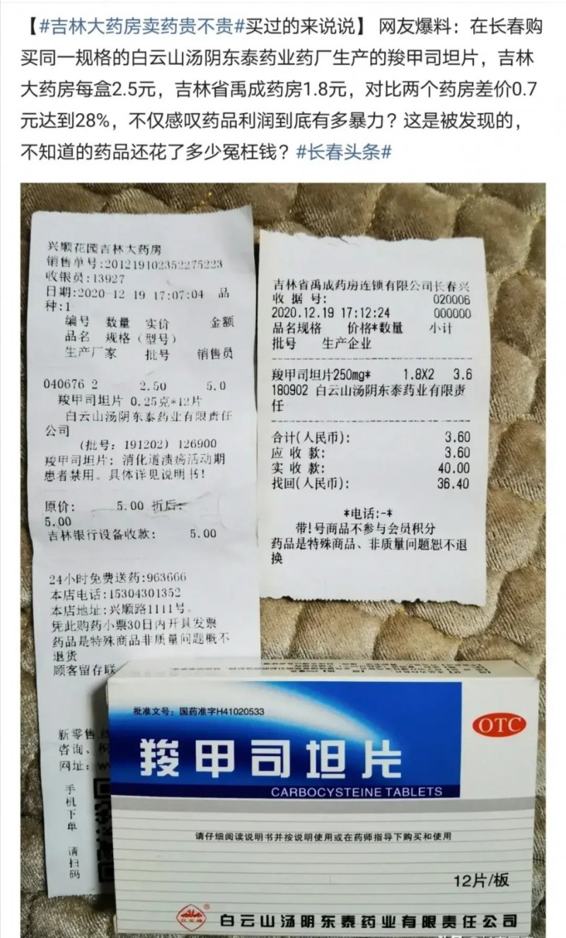 后來(lái)發(fā)現(xiàn)有點(diǎn)不對(duì)勁了,去吉林大藥房藥店賣藥的推薦的都是比較貴的藥,普通的感冒要花70-80 甚至上百元,想買的藥卻都說(shuō)沒有,而且很多藥發(fā)現(xiàn)都貴了很多…